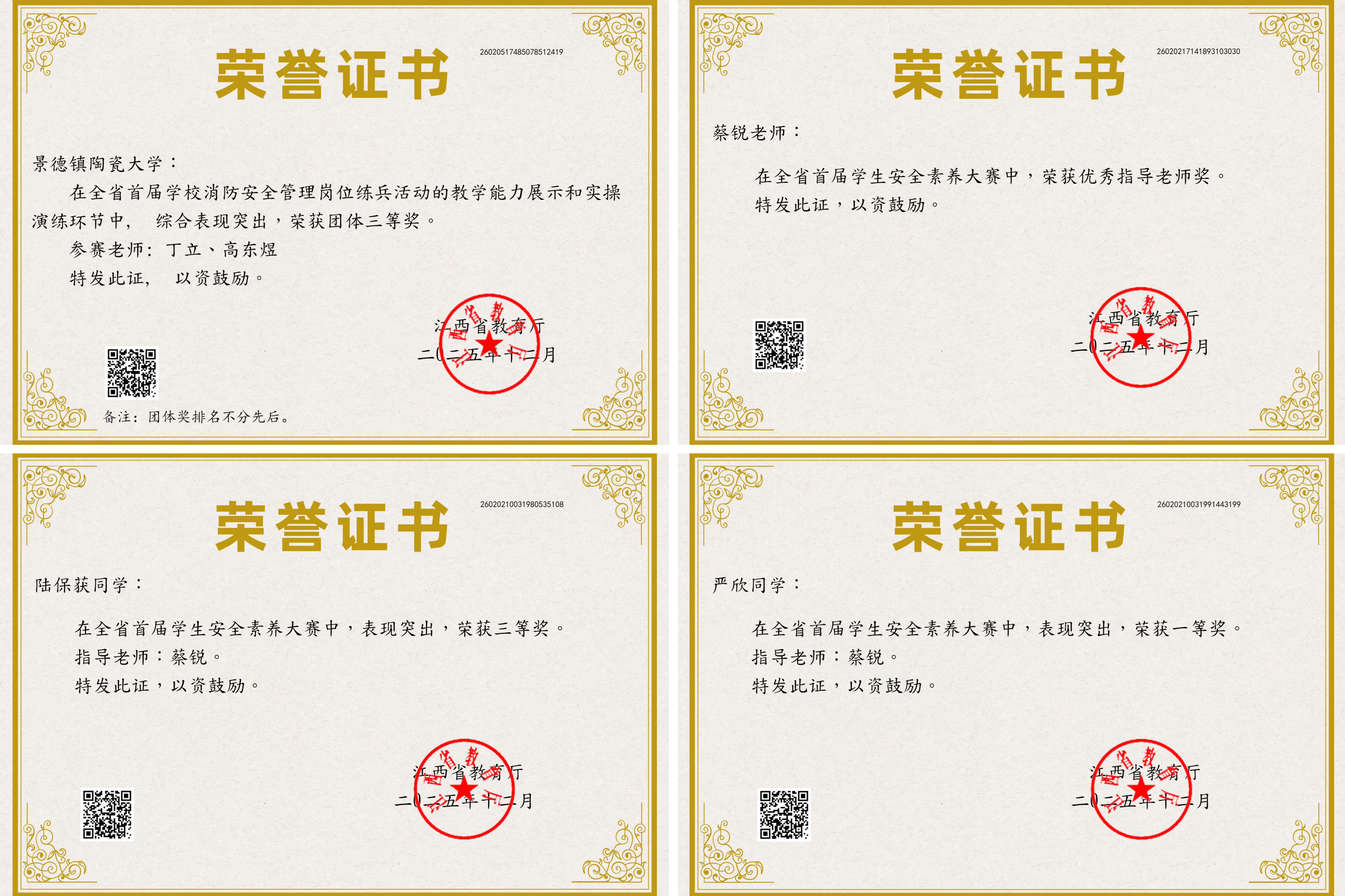 本网讯(保卫处 蔡锐)近日,江西省教育厅公布了全省首届教育系统安全素养大赛获奖结果。我校学子共斩获高校组一等奖1项,三等奖1项,保卫处教师蔡锐荣获“优秀指导老师奖”,我校在全省学校消防安全管理岗位练兵活动中荣获“团体三等奖”(参赛老师:丁立、高东煜)。此次大赛分学生安全素养大赛(含高校组和中小学、中...