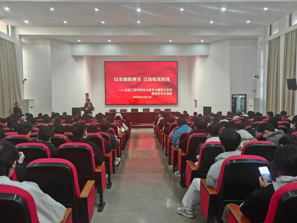 本网讯(信息工程学院 汪芯竹)为深入贯彻落实平安校园建设工作要求,强化师生安全防范意识与应急处置能力,12月17日,信息工程学院以“以实操练硬功以演练筑防线”为主题,成功开展安全教育主题党日活动暨消防安全演练。校党委常委、副校长冯浩,保卫处有关负责人及学院党政领导班子、全体教师、学生党员代表共同参与,...