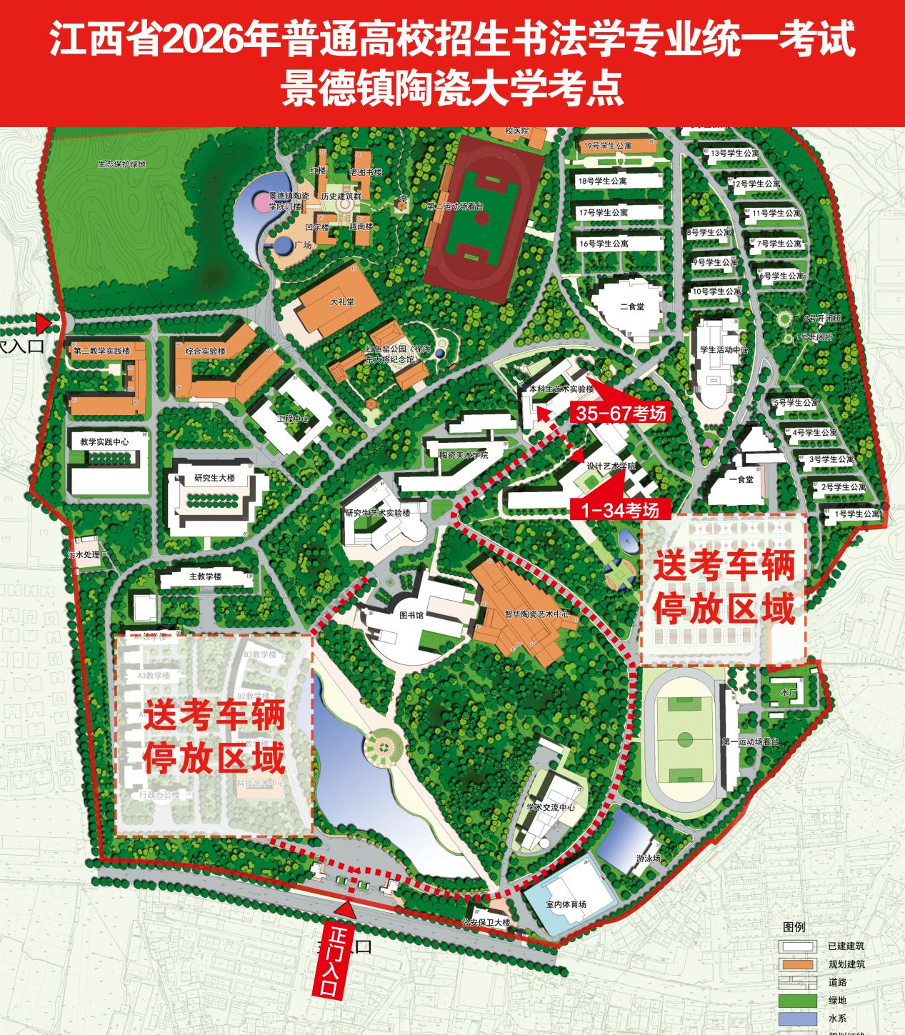 送考车辆从校大门进入,按指引有序停放到考场警戒线外周边停车位。司机、陪同人员请在停车区域内活动和等候,请勿进入其他区域。