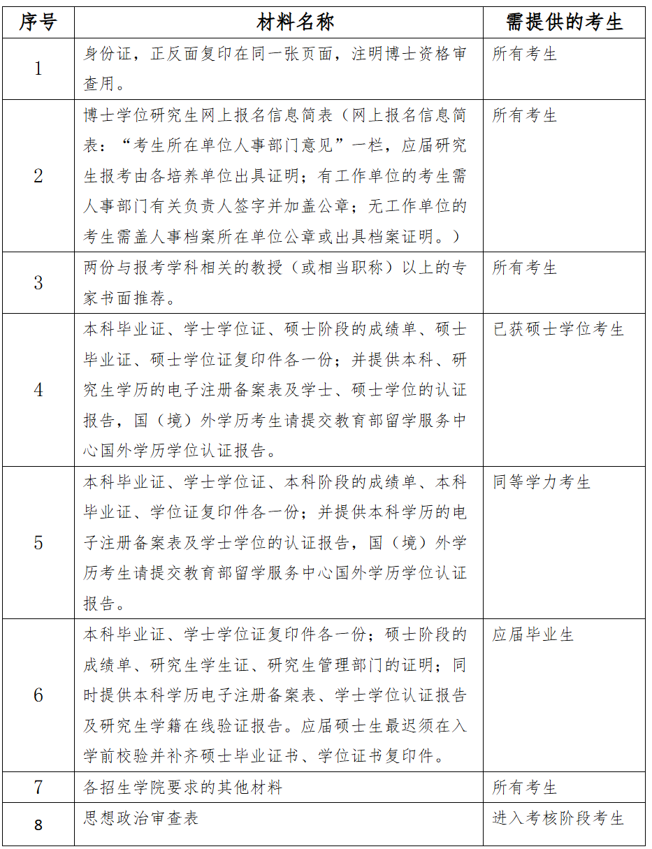 报考材料(含电子版材料)为以下内容:其中材料1、2、3、7每位考生必须提交,材料4、5、6、8请考生具体参照各自类别提交。