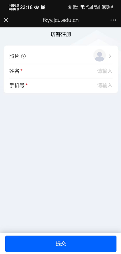 3、点击跳转后首先是访客注册界面,访客需要手动上传自己的照片(只需要上传一次即可,而且务必进行上传,否则流程审批通过后访客人脸无法下发到校门口人脸门禁),之后输入姓名、手机号后点击提交即可完成注册。