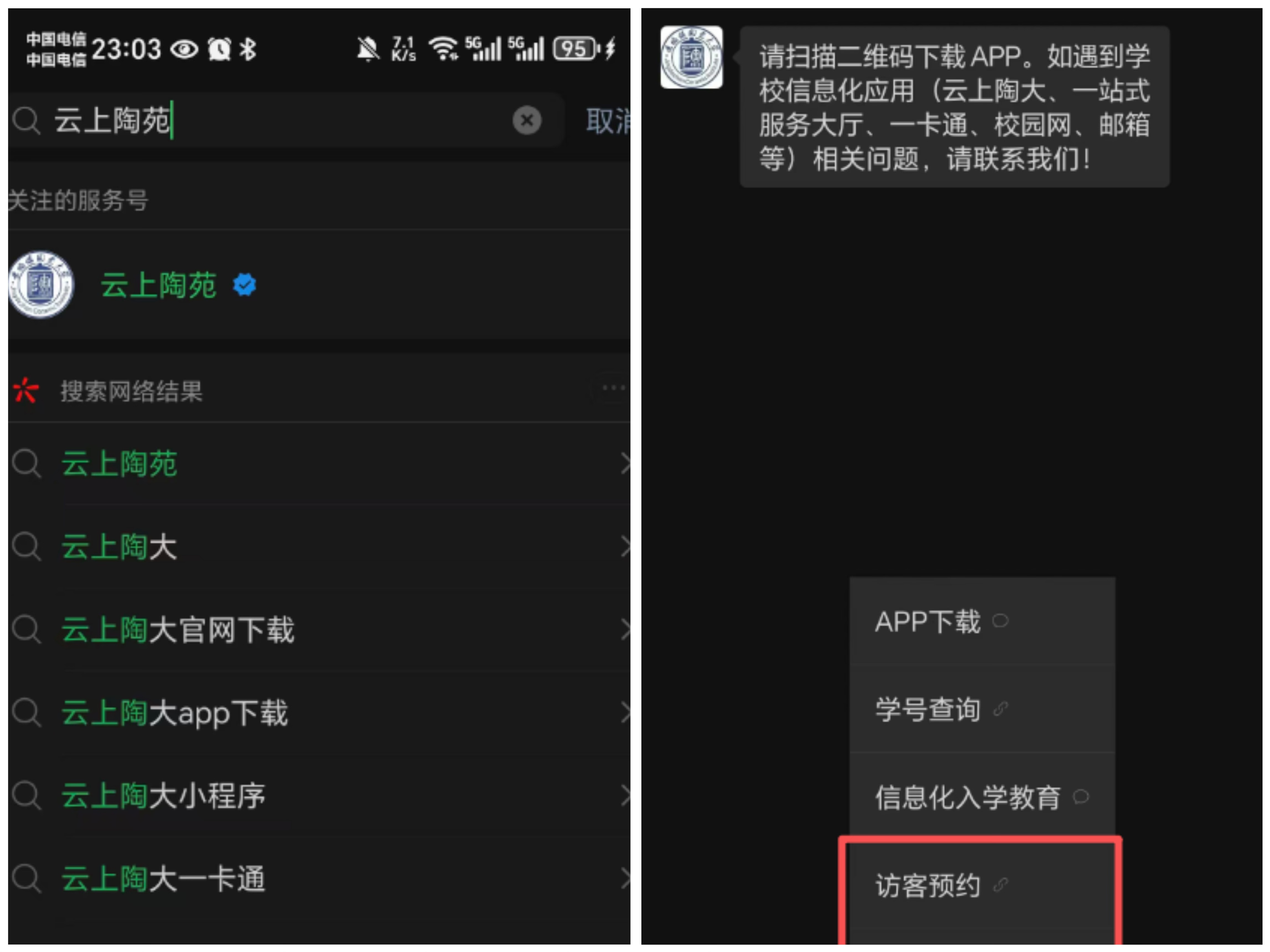 2、云上陶苑与云上陶大均可跳转至访客预约界面,点击服务号访客预约菜单,两个服务号的访客预约菜单位置如下图所示: