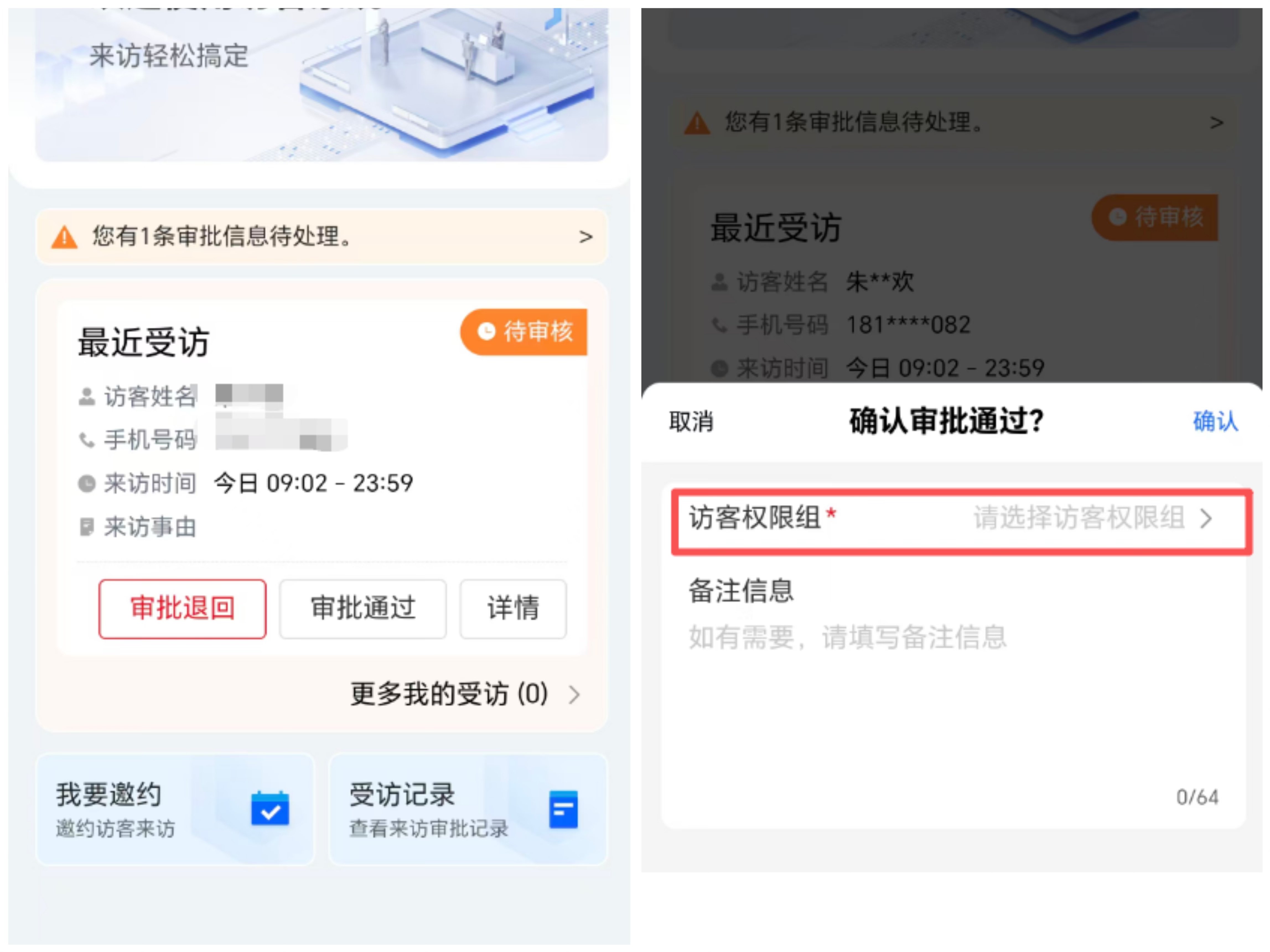 2、注册成功后可以在首页查看访客提交的预约信息,进行审批,服务号也会同步推送审核提醒,可通过提醒跳转至审批界面,记得选择访客权限组再确认。