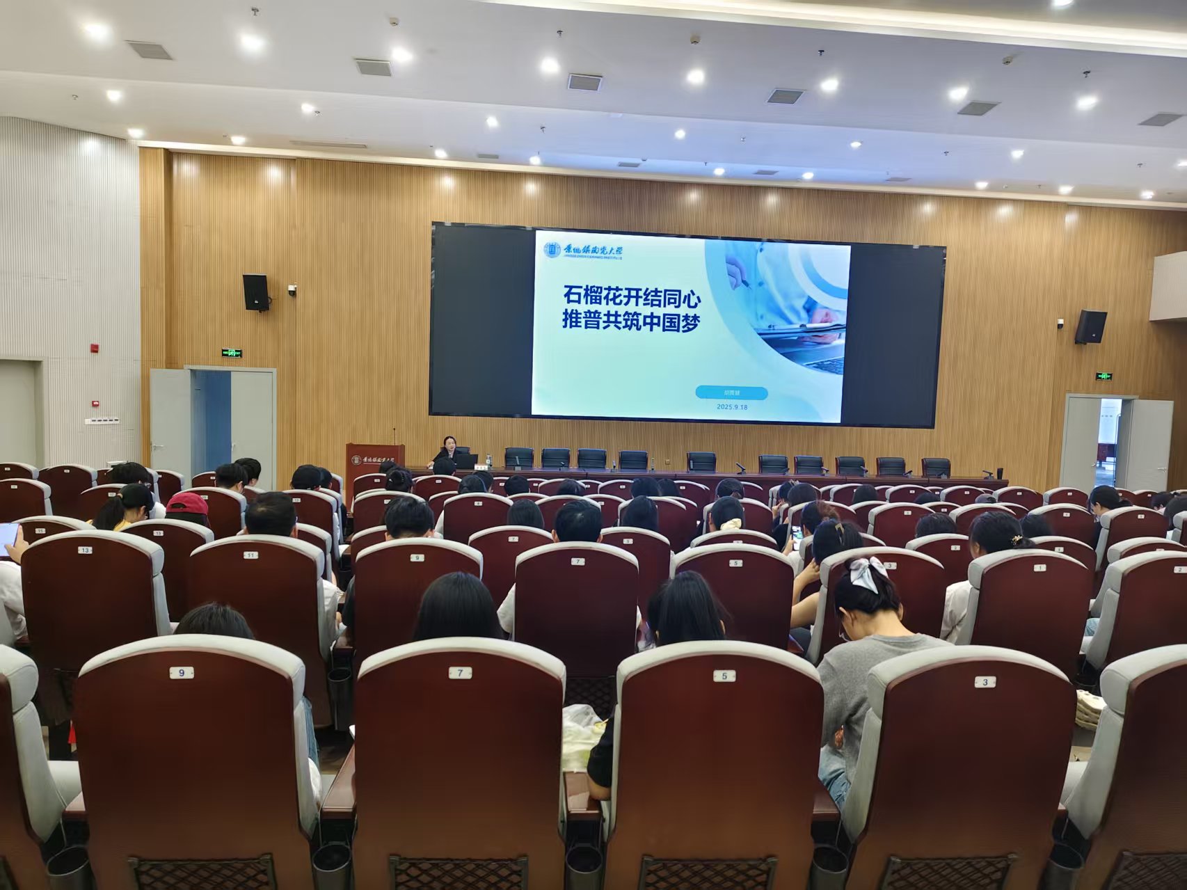 9月18日,马克思主义学院胡菁慧博士、副教授,以“石榴花开结同心、推普共筑中国梦”为主题,给全校师生带来推普实训教学讲座。她针对学生因方言产生的发音问题,以真实沟通案例为切入点, 围绕 “为什么学、什么是普通话、如何学用”三大核心问题,开展了系统性推普实训讲座。