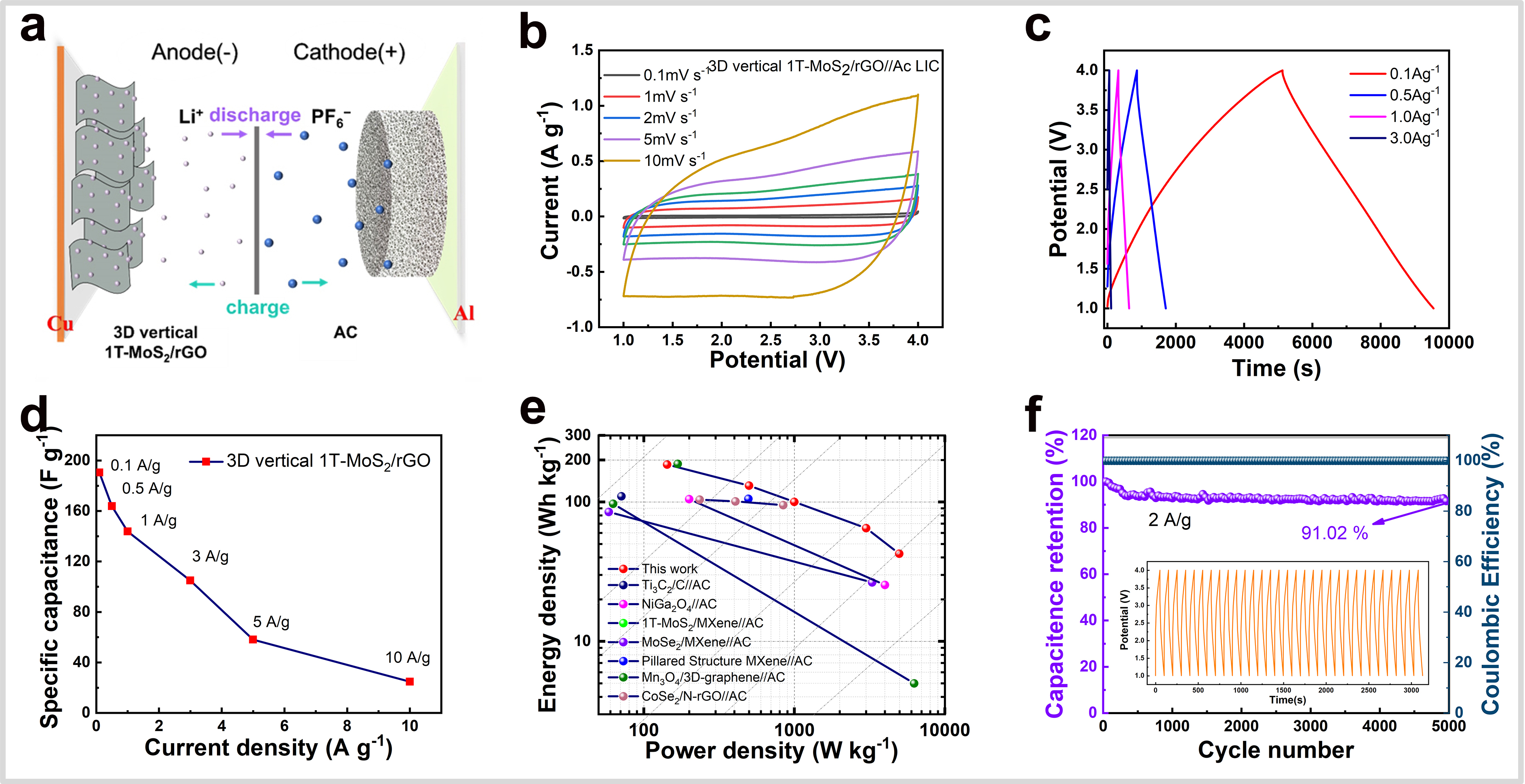 图4. (a)电荷储存机制,(b) CV曲线,(c)充电/放电结果和(d)不同电流密度下的比电容;(e) Ragone图,(f)循环性能图。