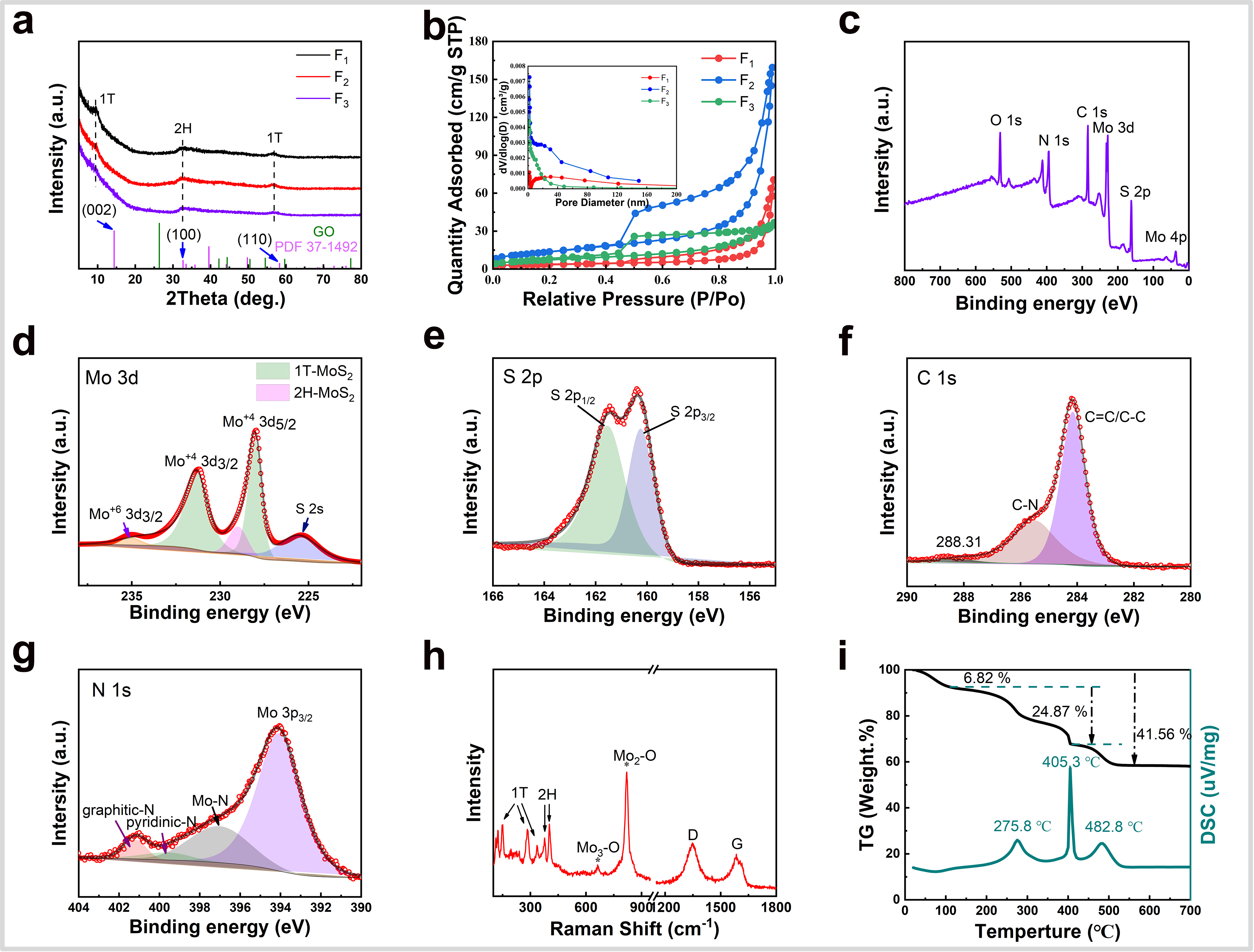 图2. (a) 3D垂直1T-MoS2/rGO复合材料(F1-F3)的XRD图和(b) N2吸附/解吸等温线(插图是相应的孔径分布);F2的(c-g) XPS光谱结果、(h)拉曼光谱和(i) TG-DSC曲线。