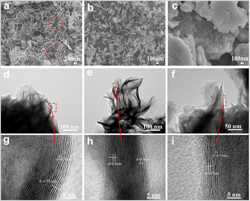 图1. (a-c)高倍扫描电子显微镜图像,(d-f)透射电子显微镜图像,(g-i)高分辨率透射电子显微镜图。