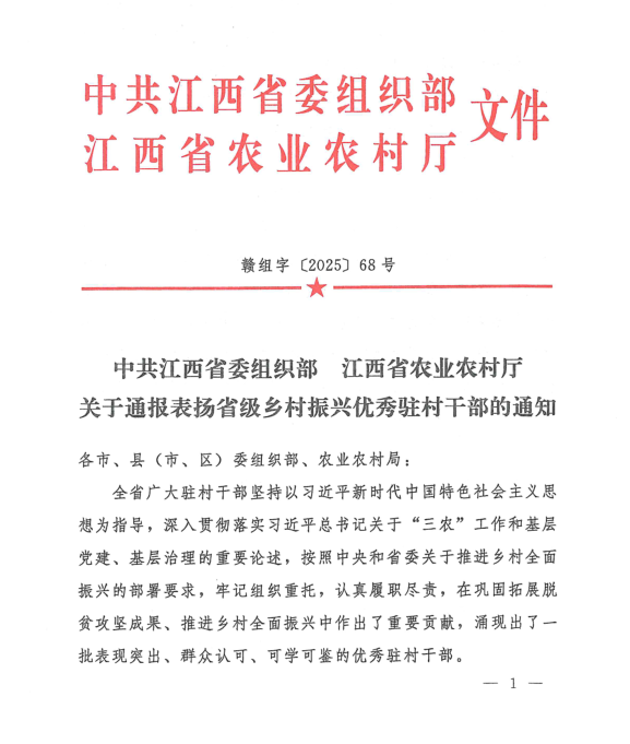 本网讯(党委组织部 彭天旺)近日,中共江西省委组织部、江西省农业农村厅发布了《关于通报表扬省级乡村振兴优秀驻村干部的通知》,我校驻乐平市众埠镇南界首村第一书记兼工作队长柯大为同志荣获“江西省乡村振兴优秀驻村干部”称号。