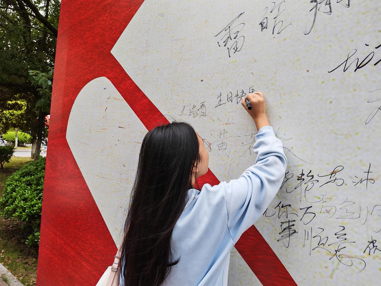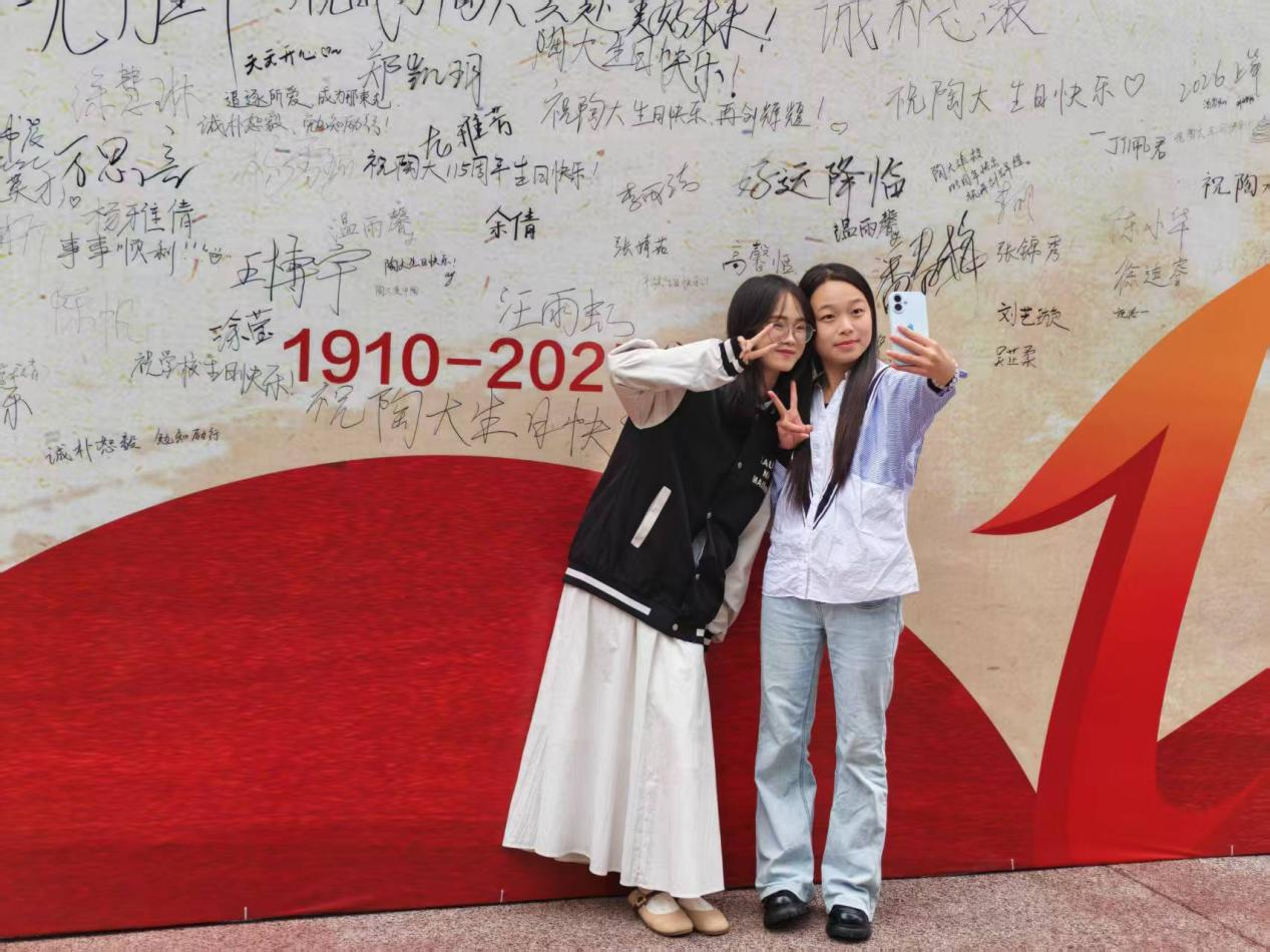 校庆期间,学校在湘湖校区大门和新厂校区主干道旁设置了以“百十五载,陶大与你同在”为主题的大型喷绘,彰显学校115年办学的深厚底蕴与时代新姿。同时,“我与陶大共华章”115周年校庆签名寄语墙也吸引广大师生驻足留言。一笔一划,皆是情谊。“祝陶大生日快乐!”唤起无数陶大人的共鸣,大家纷纷执笔留名,表达对母校的深情祝福。