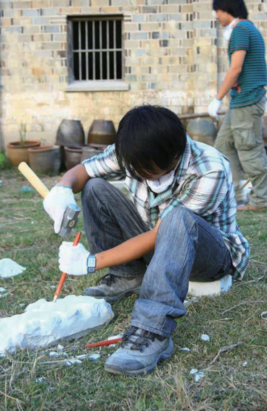 麻汇源在创作石雕作品