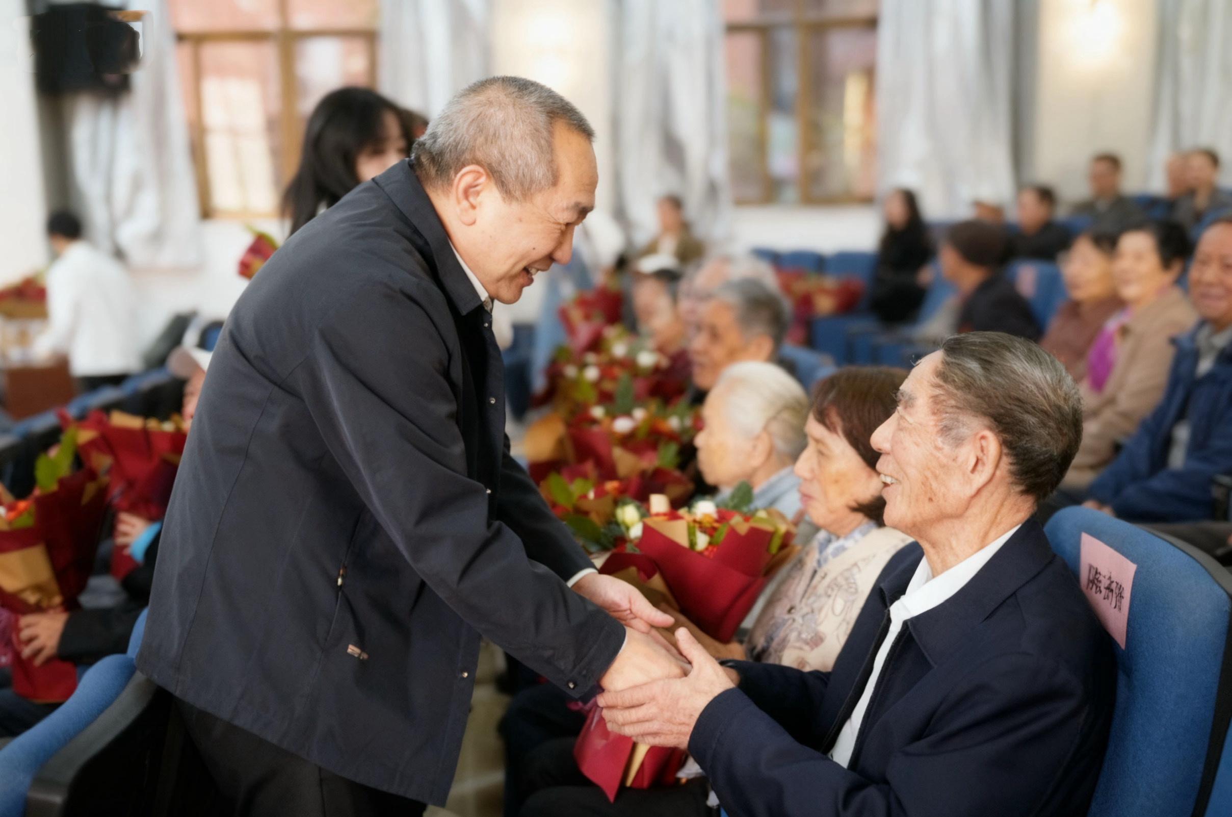 祝寿会现场,离休老同志们相互问候、热烈畅谈,会场内洋溢着温馨的节日氛围。一年一度举办祝寿会是学校传统的重阳节特色敬老活动,让老同志们感受到来自学校的温暖。