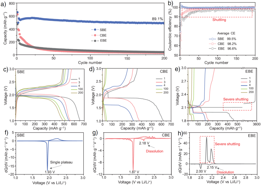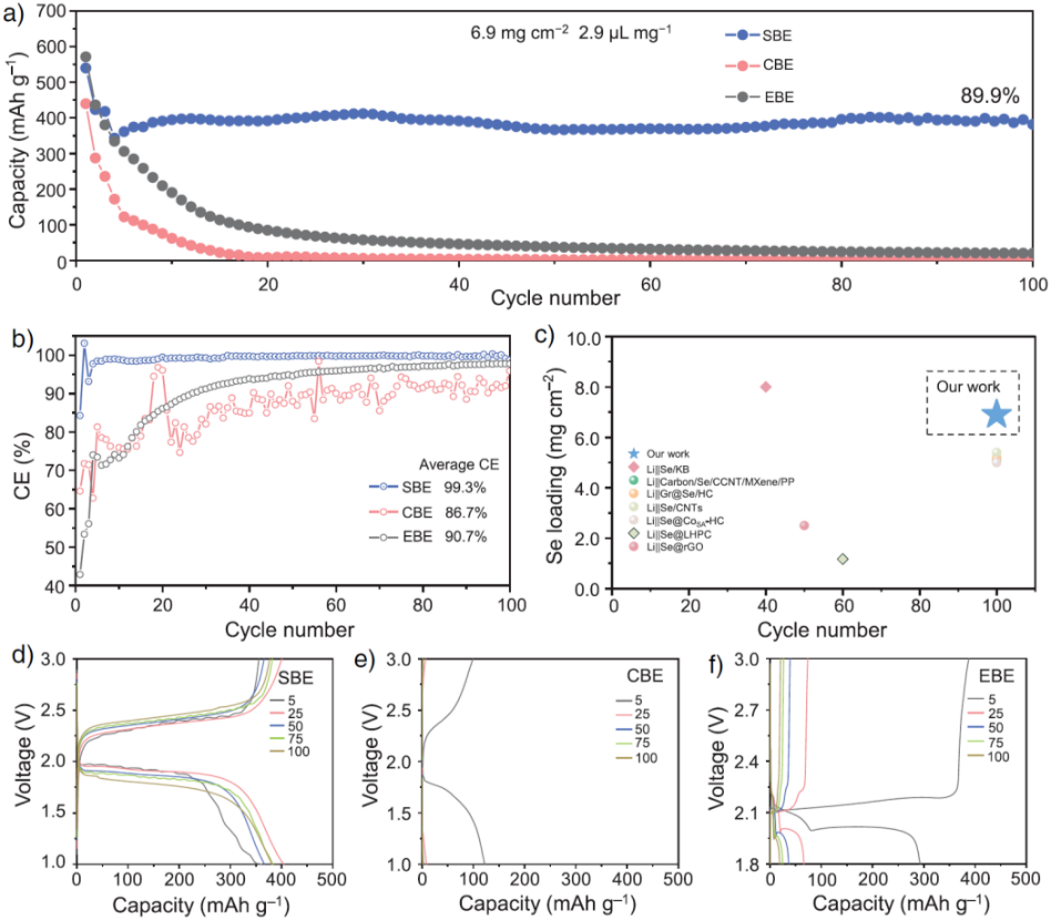 图2. Li||Se电池循环与CE性能:SBE体系平均库伦效率达99.5%,远优于碳酸酯与醚系电解液。