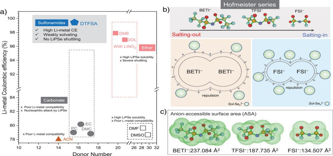 图1.电解液设计原理:BETI-体积大、供电子能力弱,依据霍夫曼序列有效抑制多硒化物溶解。