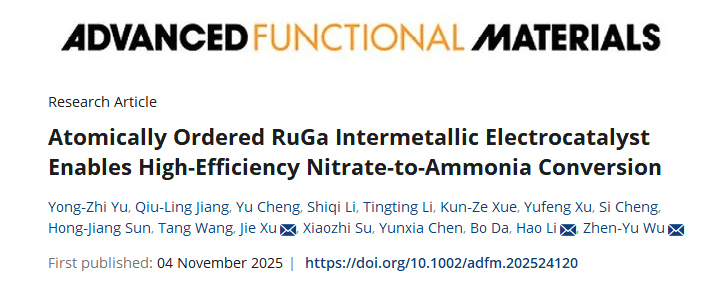 本网讯(国家日用及建筑陶瓷工程技术研究中心 谭丽)近日,我校国家日用及建筑陶瓷工程技术研究中心博士余永志以第一作者身份在国际材料领域顶级学术期刊《Advanced Functional Materials》(影响因子19.0)上发表题为《Atomically Ordered RuGa Intermetallic Electrocatalyst Enables High-Efficiency Nitrate-to-Ammonia Conversion》(原子有序RuGa金属间化合物电催化剂实现高效硝酸盐制氨)的学术论文。南方科技大学教授吴振禹、日本东北大学教授李昊、温州大学教授许杰为论文通讯作者。