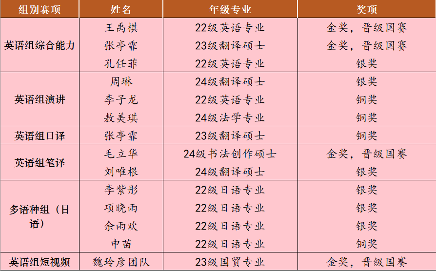 本网讯(文化传播学院 王慧杰)近日,2025年“外研社·国才杯”“理解当代中国”全国大学生外语能力大赛江西省赛系列赛事在江西中医药大学湾里校区圆满落幕。我校学生在此次大赛中凭借扎实的语言综合应用能力、良好的跨文化沟通与思辨能力、稳定的临场发挥,在六个赛项中荣获金奖4项、银奖6项,铜奖4项并晋级国赛。