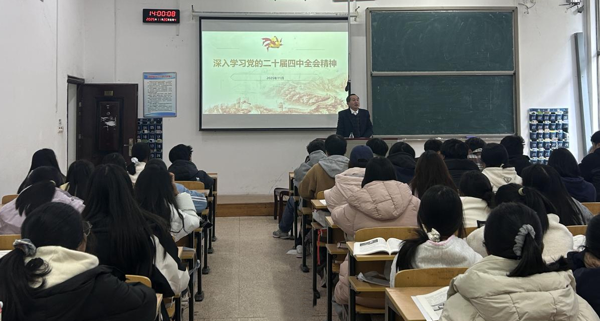 本网讯(管理与经济学院 钟威)为深入学习贯彻党的二十届四中全会精神,引导青年学生坚定理想信念、明确时代责任,11月20日下午,校党委常委、副校长黄勇以“深学细悟党的二十届四中全会精神,争做新时代有为青年”为主题,为2025级英语专业1、2班的同学们讲授了一堂内涵丰富、指导性强的专题思政课。