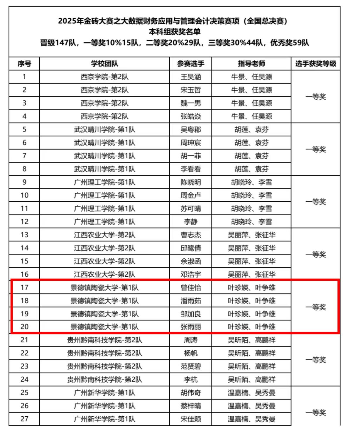 本网讯(管理与经济学院 叶珍媖)11月23日,2025年“一带一路”暨金砖国家技能发展与技术创新大赛之大数据财务应用与管理会计决策赛项总决赛圆满收官。我校管理与经济学院2023级会计专业学生潘雨茹、张雨丽、曾佳怡、邹加良(指导老师:叶珍媖、叶争雄),以区域赛第一名的优异成绩从147支队伍中脱颖而出,代表我校参加全国总决赛,最终荣获总决赛本科组一等奖。