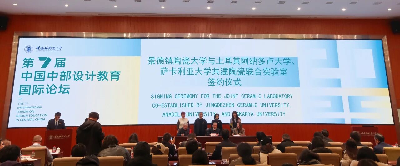 本网讯(党委宣传部)12月4日上午,第七届中国中部设计教育国际论坛在景德镇陶瓷大学湘湖校区国际学术报告厅举办。在论坛开幕仪式中,景德镇陶瓷大学与土耳其阿纳多卢大学、萨卡里亚大学共建陶瓷联合实验室签约仪式隆重举行。景德镇陶瓷大学党委书记蒲守智、景德镇市委常委、组织部部长林蓉以及阿纳多卢大学和萨卡里亚大学学院代表出席并共同见证。景德镇陶瓷大学党委常委、副校长黄勇代表学校,与土耳其阿纳多卢大学副校长Kocdar Sepril(考克达尔·塞尔皮尔)、萨卡里亚大学副校长Halit Yaşar(哈利特·亚萨尔)共同签署协议。仪式由景德镇陶瓷大学党委副书记王海波主持。我校国际合作与交流处、科学技术处、材料科学与工程学院、设计艺术学院、考古文博学院等相关单位负责人与中外师生代表两百余人一同参与了此次活动。
