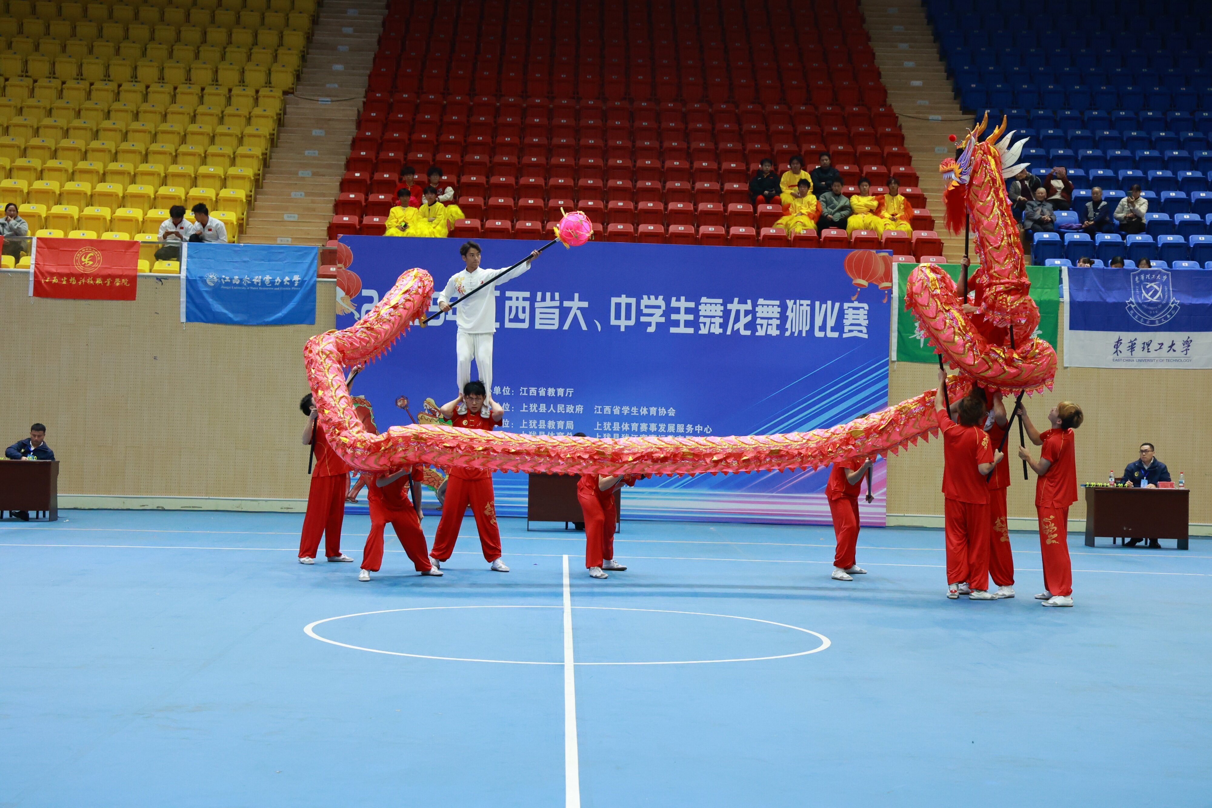 本网讯(体育与军事教学部 潘桃铃)近日,由江西省教育厅主办,上犹县人民政府、江西省学生体育协会承办的2025年江西省大学生舞龙舞狮比赛在上犹县文体中心正式拉开帷幕。赛事吸引了全省40所高等院校的660余名运动员、教练员及领队参赛。我校舞龙队首次参加该类赛事,在体育与军事教学部教师王亮华和潘桃铃的带领下,我校学子以崭新的姿态投身舞龙竞技舞台,最终在舞龙规定套路项目中,荣获全省第四名的成绩。