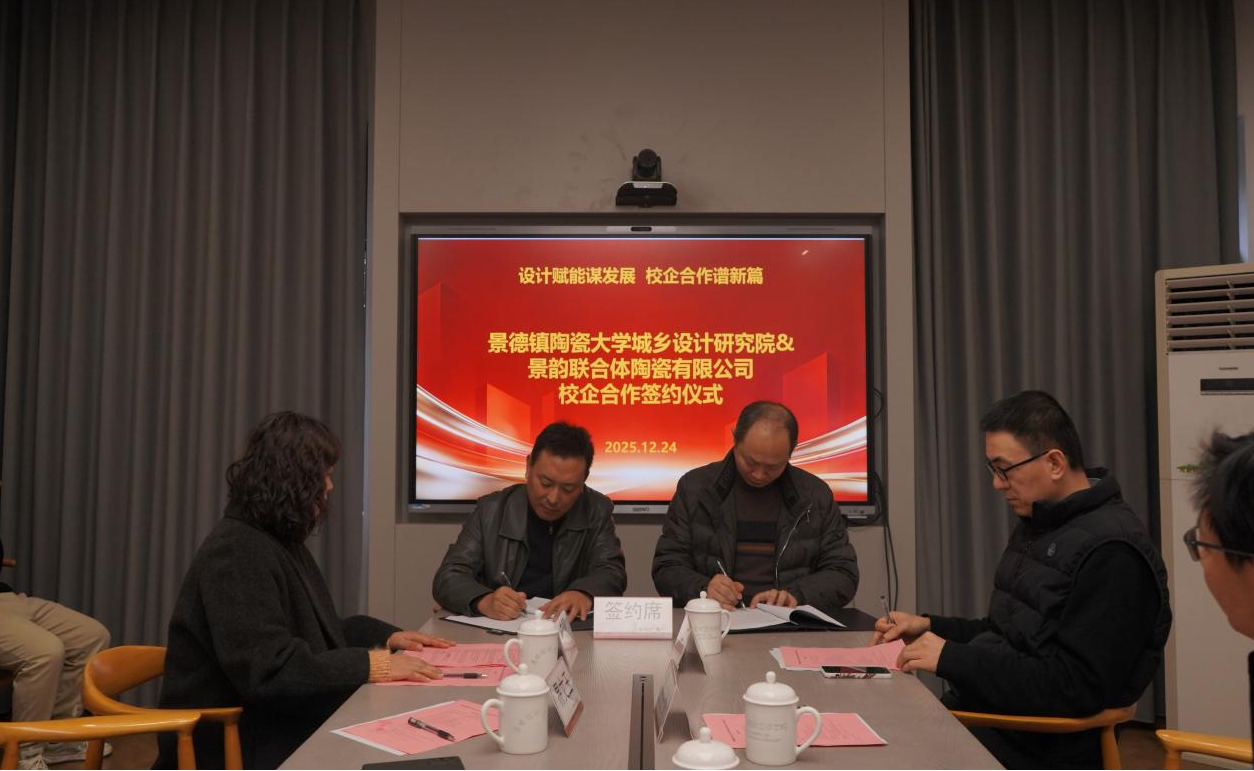 本网讯(设计艺术学院)为深入贯彻产教融合发展战略,构建校企协同育人新生态,12月24日上午,我校城市与乡村艺术设计研究院与景韵联合体陶瓷有限公司校企合作签约仪式在设计艺术学院二楼会议室举行。设计艺术学院党委书记段为松、景德镇景韵联合体陶瓷有限公司董事长易文金出席会议并讲话。城市与乡村艺术设计研究院执行院长、设计艺术学院副教授曹上秋,设计艺术学院师生代表及景德镇景韵联合体陶瓷有限公司相关负责人参会。