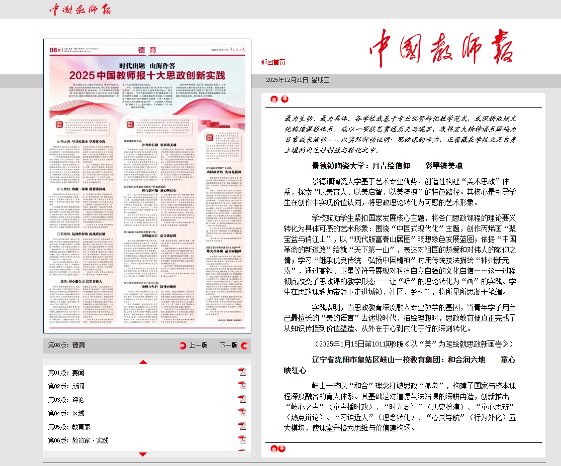 本网讯(党委宣传部) 12月31日,景德镇陶瓷大学“丹心绘信仰,彩墨铸美魂”思政创新实践项目成功入选2025年《中国教师报》十大思政创新实践。近年来,学校依托艺术专业优势,创造性构建“美术思政”体系,探索“以美育人、以美启智、以美铸魂”的特色路径。其核心是引导学生在创作中实现价值认同,将思政理论转化为可感的艺术形象。