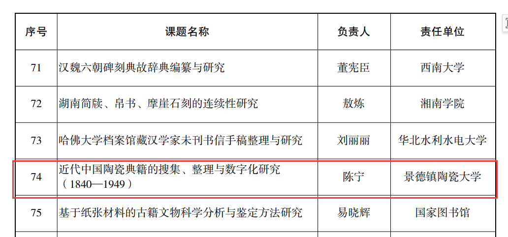 陈宁教授获批的学者个人项目《近代中国陶瓷典籍的搜集、整理与数字化研究(1840—1949)》,以近代中国陶瓷典籍为研究对象,针对当前中国陶瓷典籍的存续状况不明、整理研究滞后、数字化建设滞缓、学科理论体系缺失等问题,从文献分类、文献辨伪、文献校勘、文献注释、文献版本等方面开展研究,构建近代中国陶瓷文献学理论研究体系,更好地服务于景德镇国家陶瓷文化传承创新试验区建设,为弘扬中华优秀陶瓷文化、讲好中国故事提供具体实证。