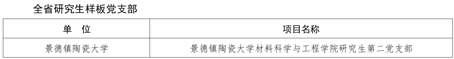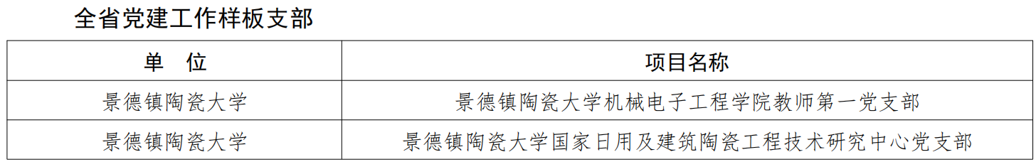 本网讯(党委组织部 梁超)近日,省委教育工委公布了全省第二批新时代高校党建示范创建和质量创优工作培育创建单位及对象名单,我校信息工程学院党委、设计艺术学院党委入选全省党建工作标杆院系培育创建单位,机械电子工程学院教师第一党支部、国家日用及建筑陶瓷工程技术研究中心党支部入选全省党建工作样板支部培育创建单位,材料科学与工程学院研究生第二党支部入选全省研究生样板党支部培育创建单位,机械电子工程学院博士研究生郑琦入选全省研究生党员标兵培育创建对象。