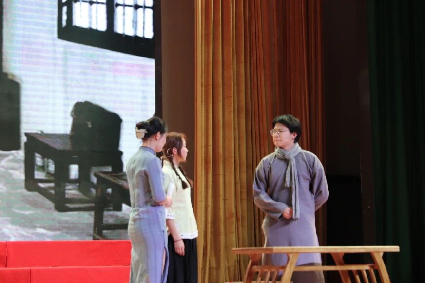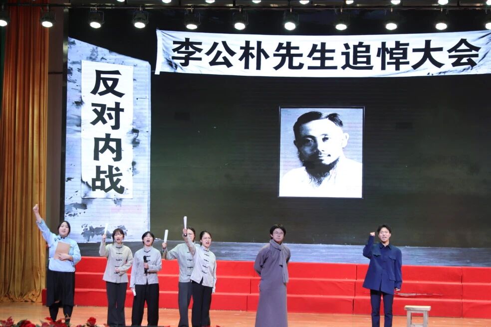 “正义是杀不完的,因为真理永远存在!”学生演员们通过情景短剧再现80年前闻一多先生的演讲,展现了爱国知识分子坚持真理、敢于斗争的精神气概。