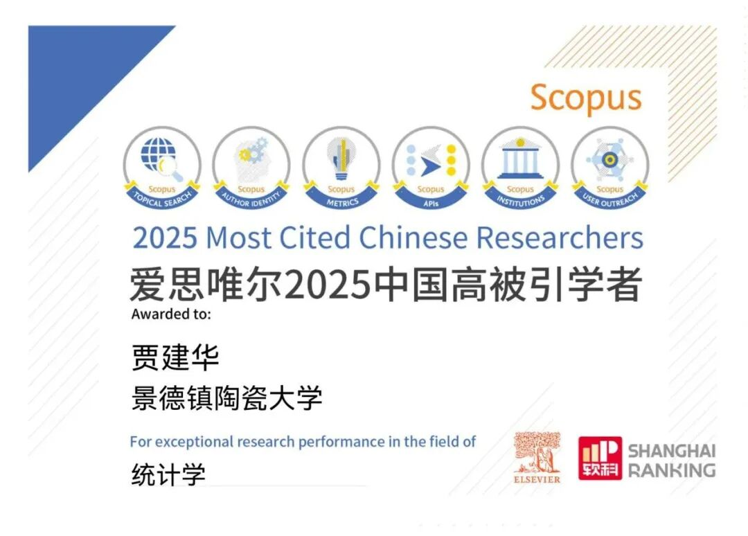 贾建华,工学博士,教授,博士生导师,江西省高校中青年学科带头人,现任景德镇陶瓷大学教务处处长,江西省数学学会常务理事。英国伯明翰大学、加拿大女王大学访问学者。主要研究方向:机器学习、数据挖掘、模式识别、生物信息学等方向,主持完成国家自然科学基金项目2项、江西省自然科学基金项目3项。以第一作者或通讯作者发表SCI收录论文40余篇,其中1篇论文入选2015年度全国百篇最具国际影响力论文,3篇论文入选ESI前1%高被引论文,2021年获江西省自然科学二等奖。据了解,爱思唯尔(Elsevier)榜单以全球权威的引文与索引数据库Scopus作为中国学者科研成果的统计来源,是各个学科、科研领域识别顶尖学者的权威依据,系统呈现了专家学者在关键技术研究和重点领域的突破创新。该榜单采用多种指标,不仅展示了学者的研究成果在学术或科研领域的影响力还精准呈现各机构、高校优势学科构成及学术影响力,以及在关键技术研究和各重点领域的顶尖人才。2025“中国高被引学者”上榜共计6310人,来自543所高校、企业及科研机构,覆盖了教育部10个学科领域、83个一级学科。