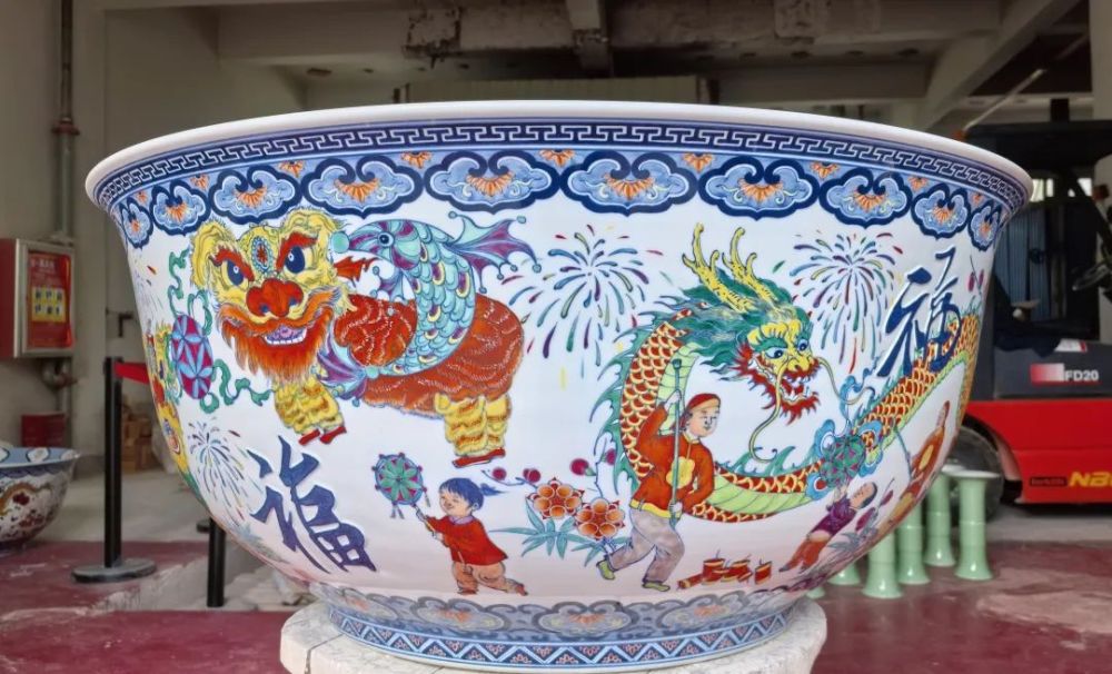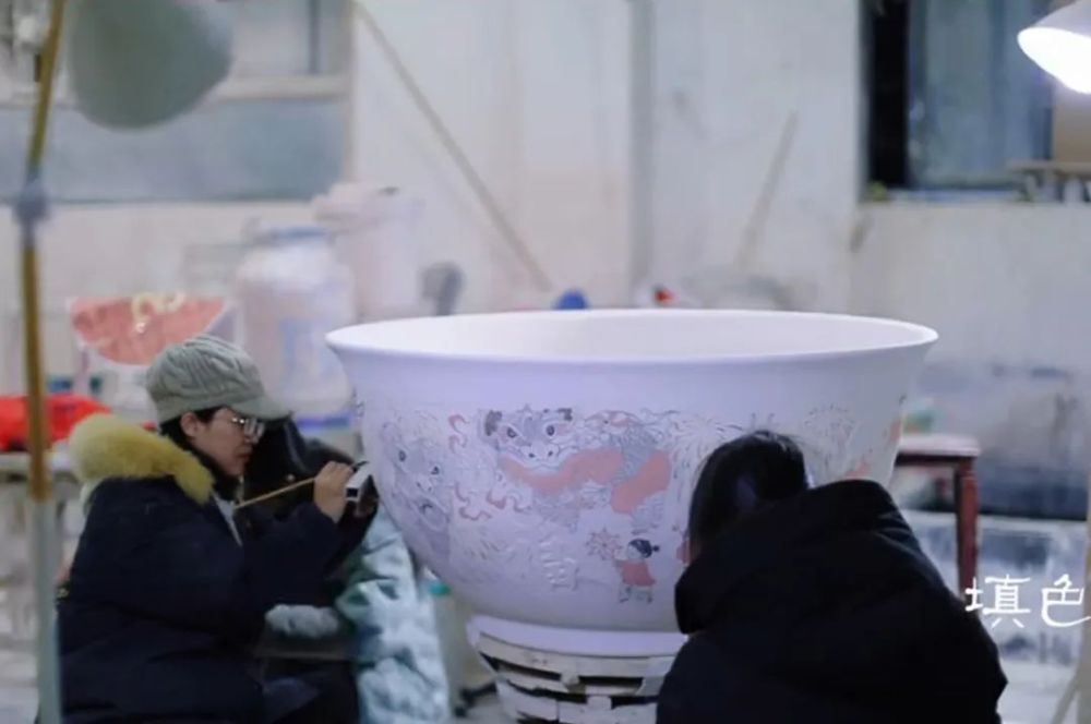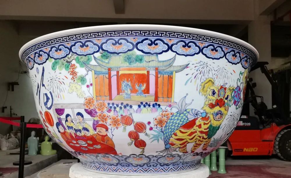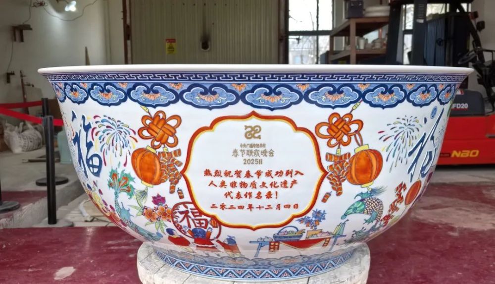 据了解,这只意义非凡的“春碗”直径1米,代表春节入遗元年,高56厘米,代表我国56个民族共同的祝愿。“春碗”以正德碗为造型,碗身环绕五个不同书法的福字,寓意五福临门,寄托人们对美好生活的向往;并采用精湛的青花斗彩陶瓷装饰工艺,将“贴窗花”“舞狮”“舞龙”“放鞭炮”“团圆饭”“看大戏”六大春节年俗巧妙融入,画面色彩明快鲜艳,洋溢着喜气,不仅展现春节热闹场景,更传递出和平、和睦、和谐的中华文明理念。