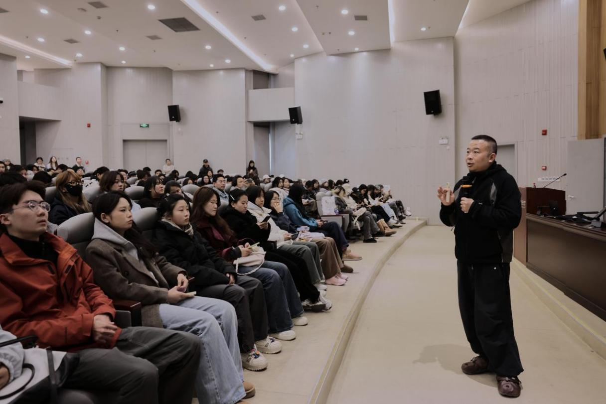 讲座中,孔洪强回顾了他的成长历程,从校内试水创业的积淀,到初入职场从基层做起,通过不断提升专业能力、积累行业经验,最终走向自主创业、创立学古品牌的发展道路。他结合切身经历分享到,中国的日用器物不应止于“能用”,更要“好用”,更要“有魂”。他勉励在场同学,不仅要以扎实专业筑牢根基,以敏锐洞察捕捉机遇,更要以果敢行动实现突破,在属于自己的人生赛道上,把握机遇,书写独属于自己的精彩篇章。
